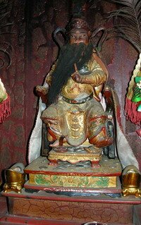 Guan Yu-the great general of heaven, patron of policemen, soldiers and protectors of law, seen as the epitome of loyalty and righteosness. He was a mortal man living in the times of the 3 Kingdoms, a much romanticized period of history in China, where he was an important figure in the civil war to dispose the Han dynasty. He is portrayed as a powerful warrior with a red face (the color, not rouge) and black hair and a long beard. Though many modern artists have taken the red face away to show that he was born a mortal. He carried a guando, which is similar to a halberd, called the Green Dragon Cresent Blade (though I have also seen it called the Black Dragon Blade,) and wears a green robe with his body armor. After his defeat and death, he was apotheisized into a god. He is a Folk god, a Taoist god, a Boddhisatva, and a Confucian ideal of the virtues of honor and loyalty. He is a very popular deity, and there is a lot of information available about him, so look him up.